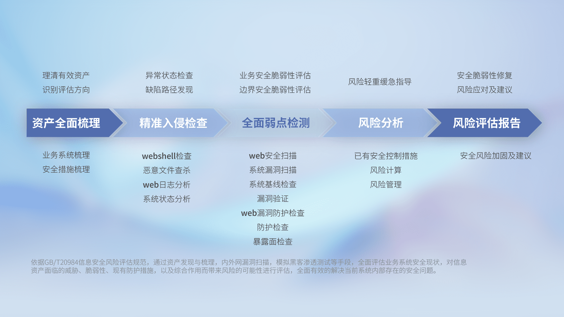 针对客户行业特性,,以专业的安全服务+多厂商联合解决方案提供专属的一站式安全管理服务,,,帮助客户全面感知网络空间威胁,,,,基于识别、、检测、、、、分析、、、、防护、、监测、、、响应的服务理论模型,,从方案咨询、、集成交付、、、评估验证、、优化加固、、、运维运营,,致力于为客户提供完整的闭环管理式安全服务。。。。以实战经验为客户打造高抵御风险的安全体系,,,帮助客户发现威胁、、、对抗威胁、、处置威胁,,,,不断积累安全对抗能力,,,,持续保障数字化安全。。