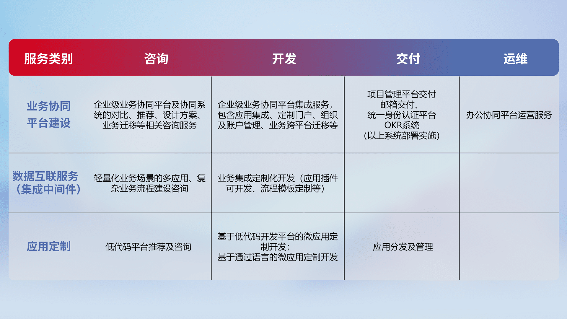 针对钉钉、、、、企微、、、、IDaas等平台级产品提供产品的规划、、方案、、、交付、、定制化开发等服务,,,实现如统一协同办公、、智能客户服务、、、、混合会议管理、、、、智能数据查询、、、等业务场景,,,,实现数字化转型。。。。
